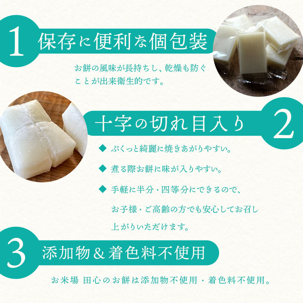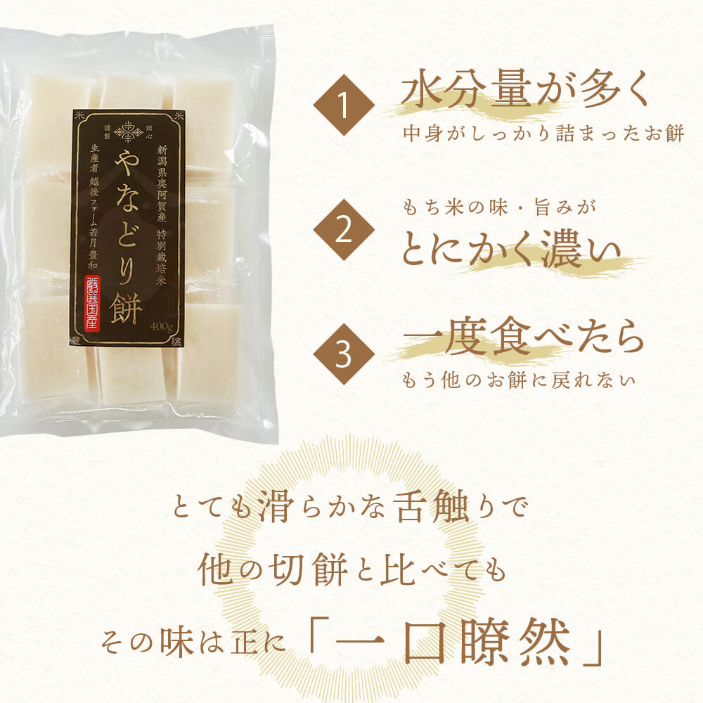 一度食べたらびっくり!他では味わえない、お米場田心の人気No.1商品の「やなどり餅」。幻のもち米、新潟県奥阿賀産やなどりを使用したお餅は、水分量が多く、もち米の味・旨みがとにかく濃いのが特徴。とても滑らかな舌触りで、他の切り餅とはレベルが格段に違います。