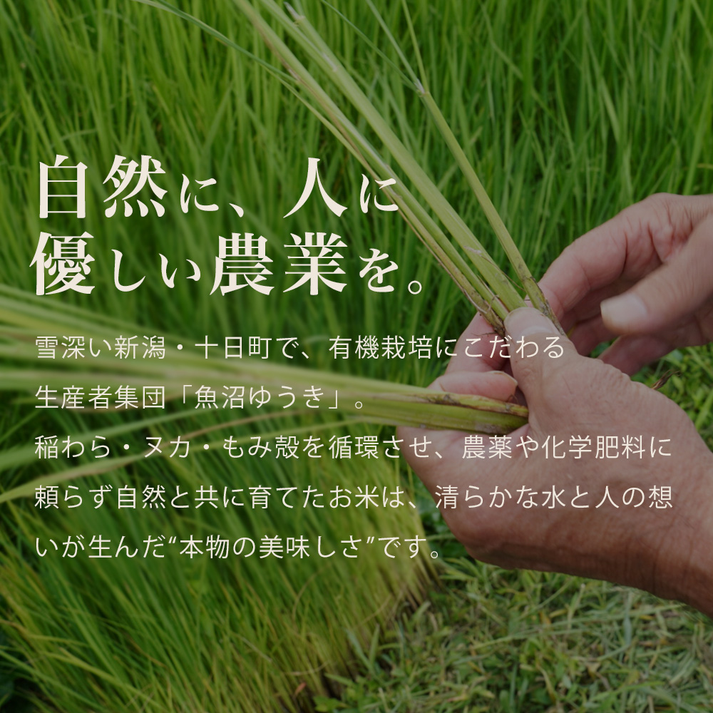 魚沼ゆうきは「自然に、人に優しい農業」を理念に掲げる生産者団体です。雪解け水が流れる十日町で、自然の力と人の手だけで米を育てることを信条としています。稲わら・ヌカ・もみ殻を循環させ、自然に逆らわず、地域と共に生きる農法を実践。化学的な力ではなく、自然の摂理と手間を重ねた丁寧な栽培が、生命力あふれるお米を育みます。