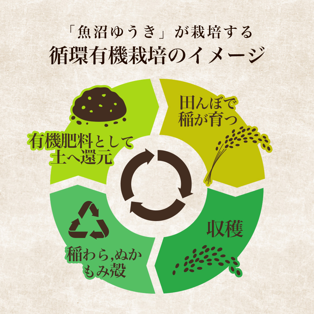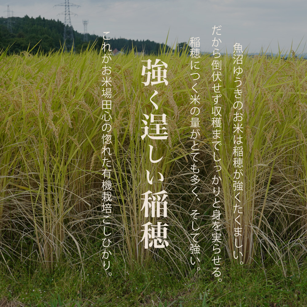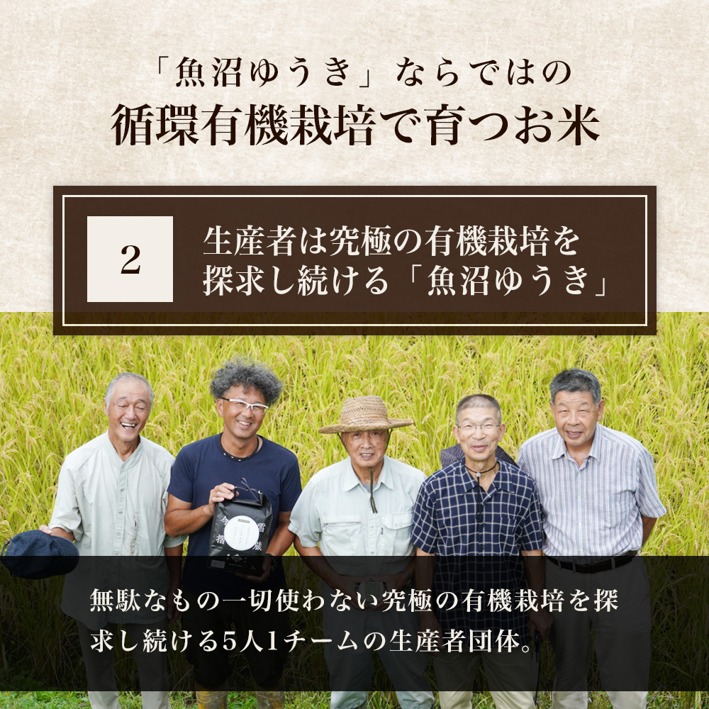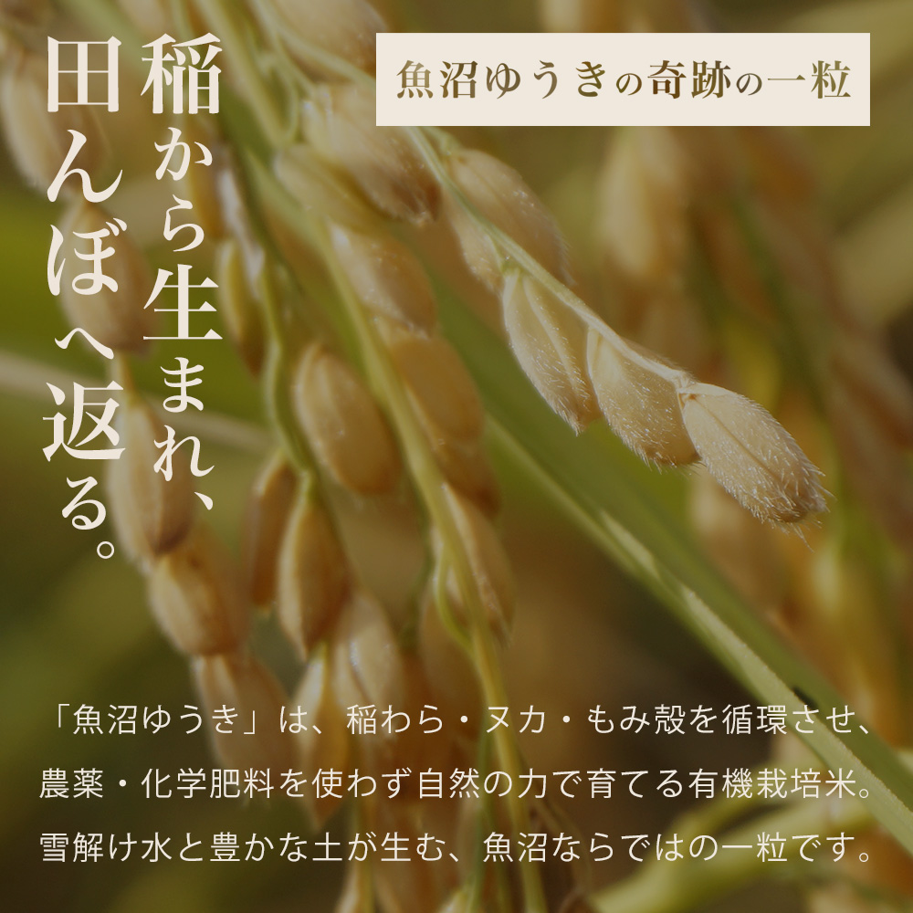 雪深い気候と豊かな自然を生かし、魚沼ゆうきのコシヒカリは有機JAS認証を受けた有機栽培で育てられています。化学肥料や農薬を一切使用せず、稲から生まれた稲わら・ヌカ・もみ殻を大切に循環させ、土本来の力を引き出します。その結果、粒立ちが良くふっくらとした炊き上がりに。もちもちとした粘りと上品な甘みが広がり、冷めても味が損なわれない“本物の有機米”です。
