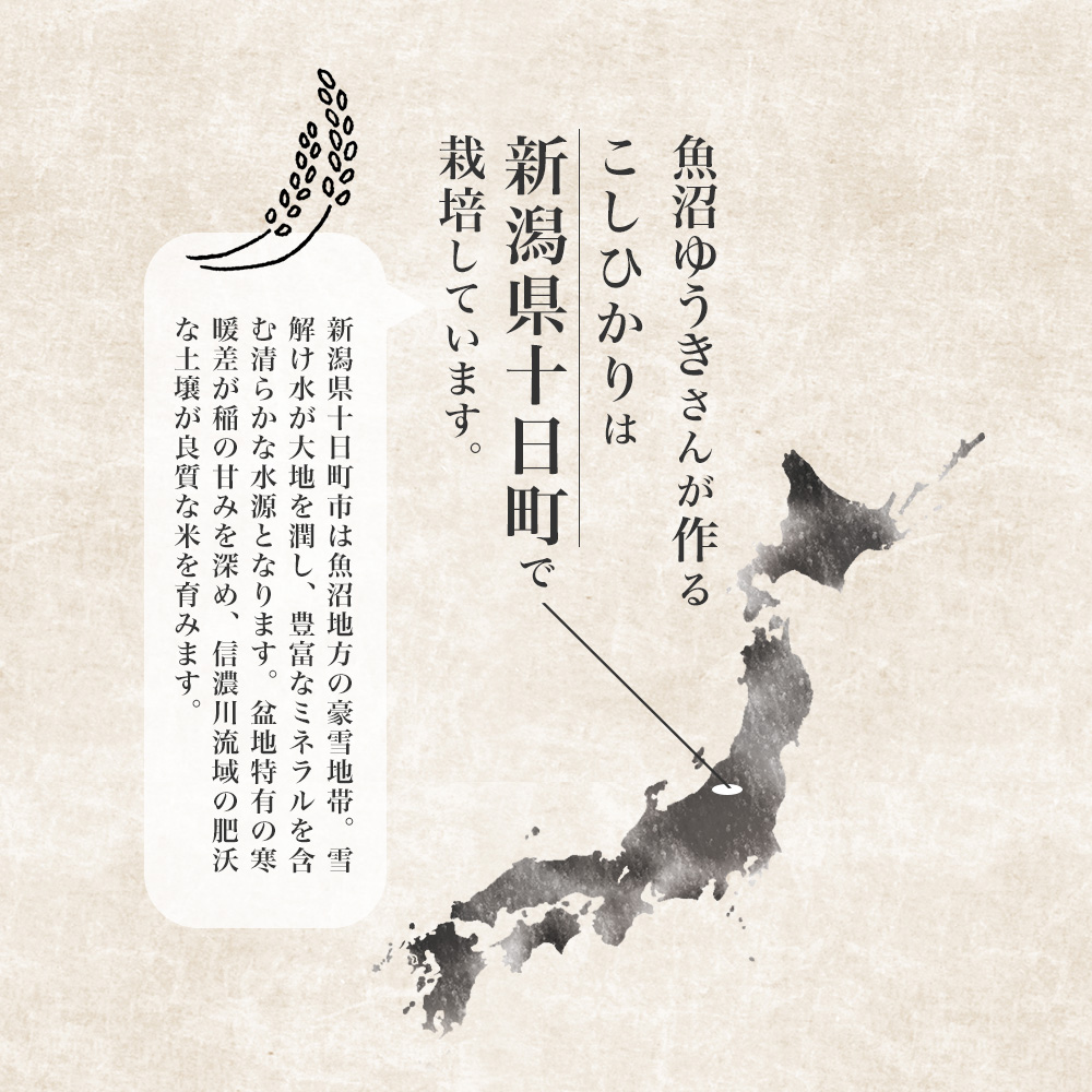 新潟県十日町市は、魚沼地方の核心に位置する豪雪地帯。降り積もる雪がゆっくりと溶け出すことで、ミネラルを豊富に含む雪解け水が田畑を潤します。盆地特有の昼夜の寒暖差が大きく、日中の光合成と夜間の冷涼な空気が稲の旨みをじっくりと引き出します。信濃川がもたらす肥沃な沖積土壌と、清らかな水・澄んだ空気が三拍子そろった十日町の地は、まさに良質米を育てる理想郷です。