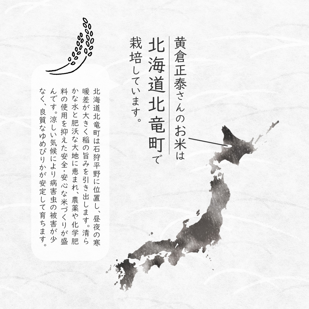北海道北竜町は石狩平野に位置し、昼夜の寒暖差が大きく稲の旨みを引き出します。清らかな水と肥沃な大地に恵まれ、農薬や化学肥料の使用を抑えた安全・安心な米づくりが盛んな地域です。涼しい気候によって病害虫の被害が少なく、良質なゆめぴりかが安定して育ちます。