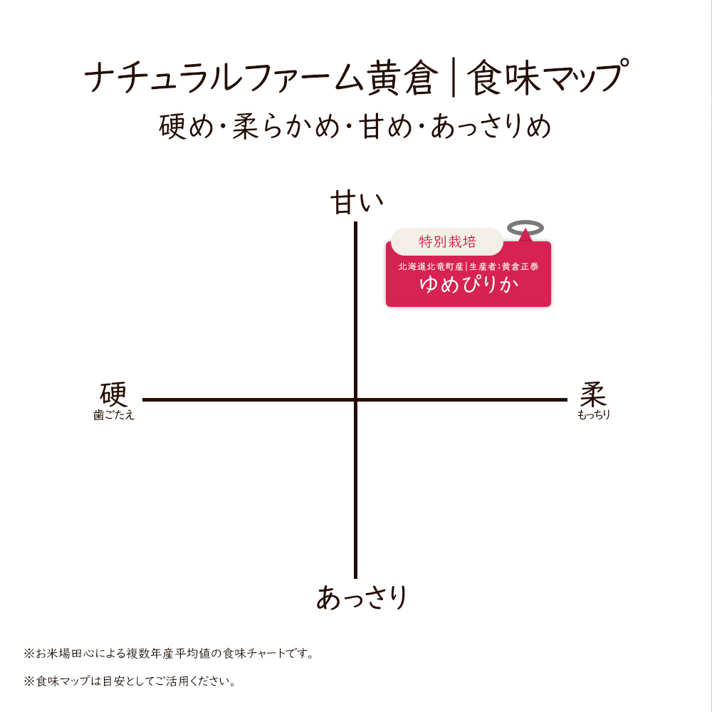 黄倉正泰さんのゆめぴりかは、北竜町の豊かな自然の中で育ちます。昼夜の寒暖差によって際立つ甘み、冷めても美味しい粘りが魅力。石狩川の水と栄養たっぷりの土壌が、粒立ちよく艶やかなお米を実らせます。化学肥料を極力使わず、自然の力を生かした栽培で、食卓に安心と美味しさを届ける一粒一粒に、生産者の真心が込められています。