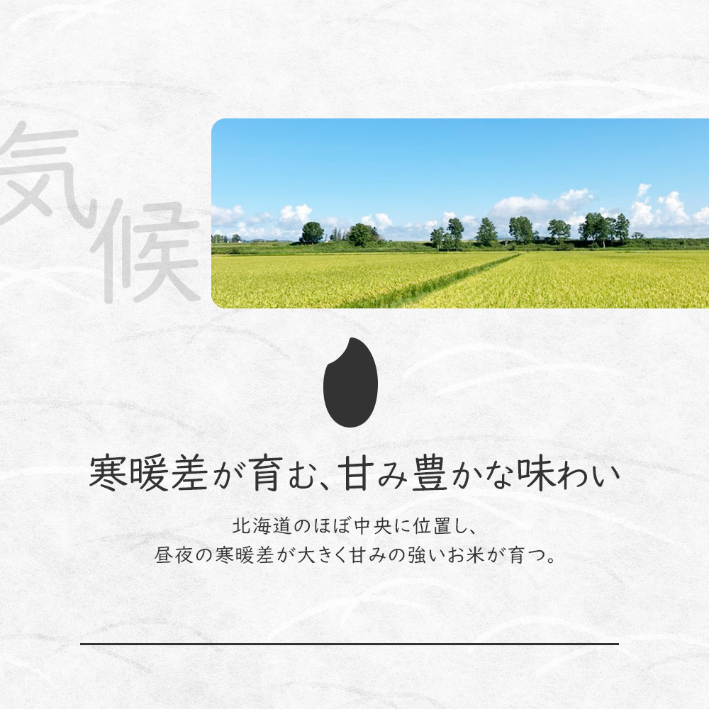 北海道のほぼ中央に位置する北竜町は、昼夜の寒暖差が大きく、甘みの強いお米が育つ地域。石狩川水系の清らかな水とミネラル豊富な土壌に恵まれ、自然環境を生かした持続可能な農業が根付いています。そんな豊かな自然が、香り高く粒立ちの良いお米を育みます。