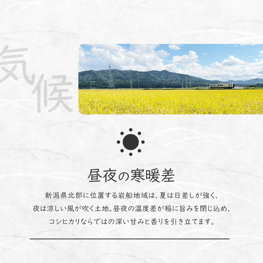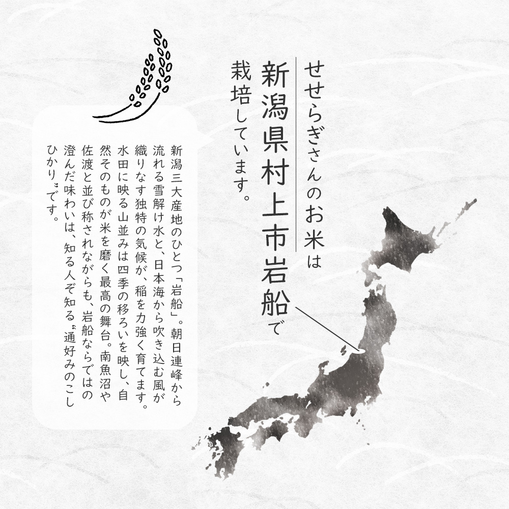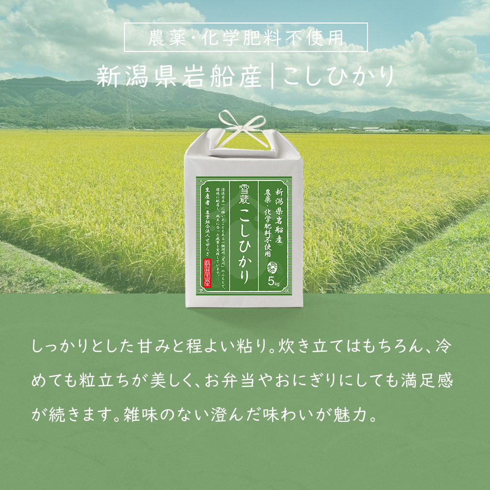 新米 令和7年産 新潟 岩船産 コシヒカリ 5kg 新潟県産こしひかり 農薬・化学肥料不使用 お米 米 精米 白米|令和6年産|越後ファーム|新潟県 岩船産|農業組合法人せせらぎさん|雪蔵米 雪蔵保管|熨斗・ラッピング無料 ▼配送予定日 お届け先: 北海道 青森県 秋田県 岩手県 宮城県 山形県 福島県 栃木県 新潟県 群馬県 埼玉県 茨城県 千葉県 東京都 神奈川県 山梨県 長野県 岐阜県 富山県 石川県 静岡県 愛知県 三重県 奈良県 和歌山県 福井県 滋賀県 京都府 大阪府 兵庫県 岡山県 鳥取県 島根県 広島県 山口県 香川県 徳島県 愛媛県 高知県 福岡県 佐賀県 大分県 熊本県 宮崎県 長崎県 鹿児島県 沖縄県 12月6日 09:00までのご注文で 最短にお届け ツイート (0件) ■商品説明 粘り気は少ないものの、十分な歯ごたえを持っている岩船産こしひかり。甘みもあり、噛めば噛むほど旨味が口の中に広がります。おいしいお米を作るためには、良質の水は欠かせません。岩船産コシヒカリは、三面川や荒川からのミネラル豊富に含んだ清流で栽培されおり、中でも荒川の水は平成の名水百選にも選ばれたほど。また、気候も美味しいお米を作るのに欠かせない要素の一つです。岩船地区は、朝晩の寒暖差が大きく、おいしいお米が育つ環境にあります。 ■商品説明 粘り気は少ないものの、十分な歯ごたえを持っている岩船産こしひかり。甘みもあり、噛めば噛むほど旨味が口の中に広がります。おいしいお米を作るためには、良質の水は欠かせません。岩船産コシヒカリは、三面川や荒川からのミネラル豊富に含んだ清流で栽培されおり、中でも荒川の水は平成の名水百選にも選ばれたほど。また、気候も美味しいお米を作るのに欠かせない要素の一つです。岩船地区は、朝晩の寒暖差が大きく、おいしいお米が育つ環境にあります。 ■カテゴリ 栽培方法 > 農薬・化学肥料不使用 生産地 > 新潟県 銘柄 > こしひかり 玄米・白米 > 生産者厳選 > 白米 量 > 5kg 商品カテゴリ > 令和7年産 新米 カテゴリから選ぶ > 白米