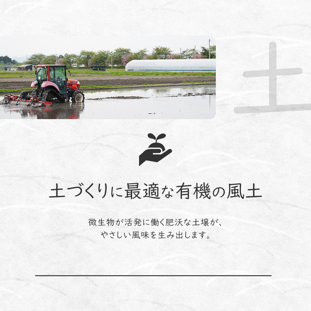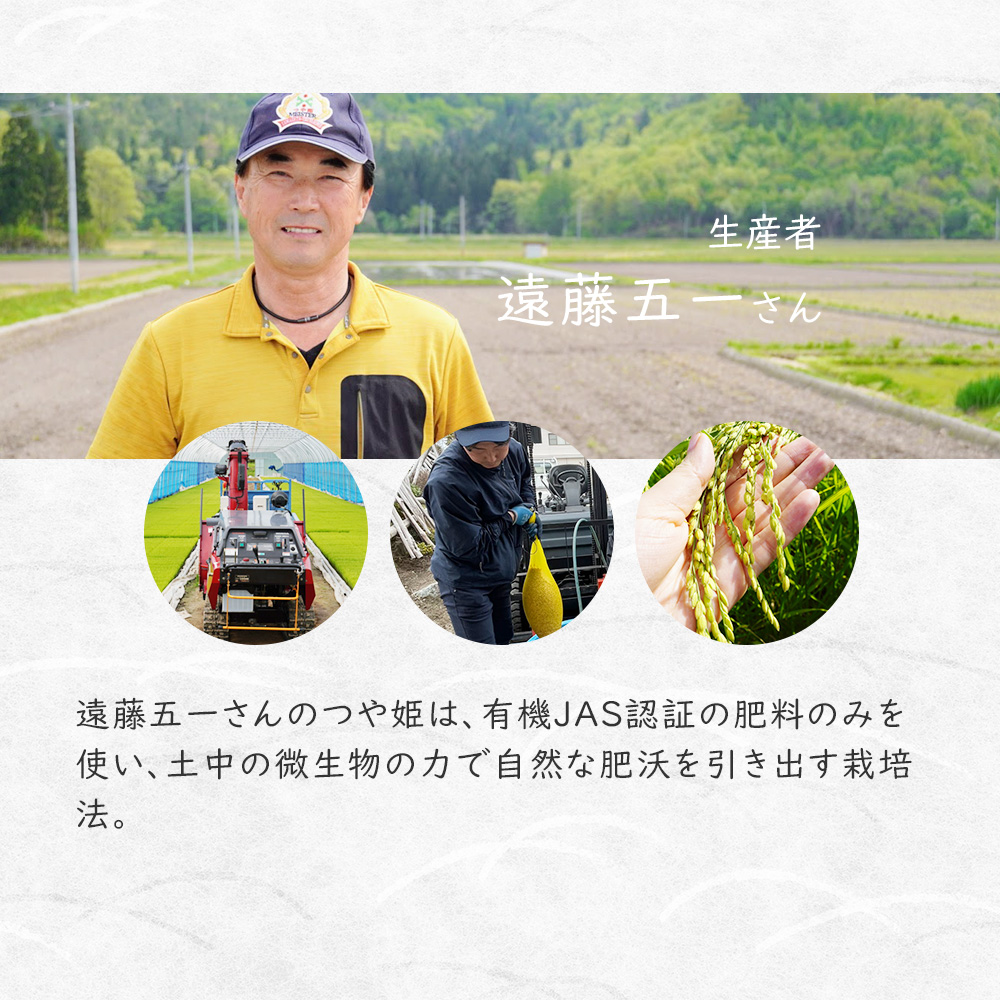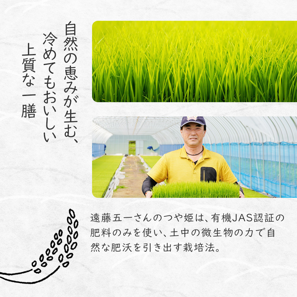 遠藤五一さんのつや姫は、有機JAS認証の肥料のみを使用し、土中の微生物の力で自然な肥沃を引き出す栽培法。農薬や化学肥料に頼らず、自然の力で粒にしなやかさと甘みを宿します。冷めてもおいしく、つややかな炊きあがりは、まさに「白ごはんを主役にできる」上品な一膳です。