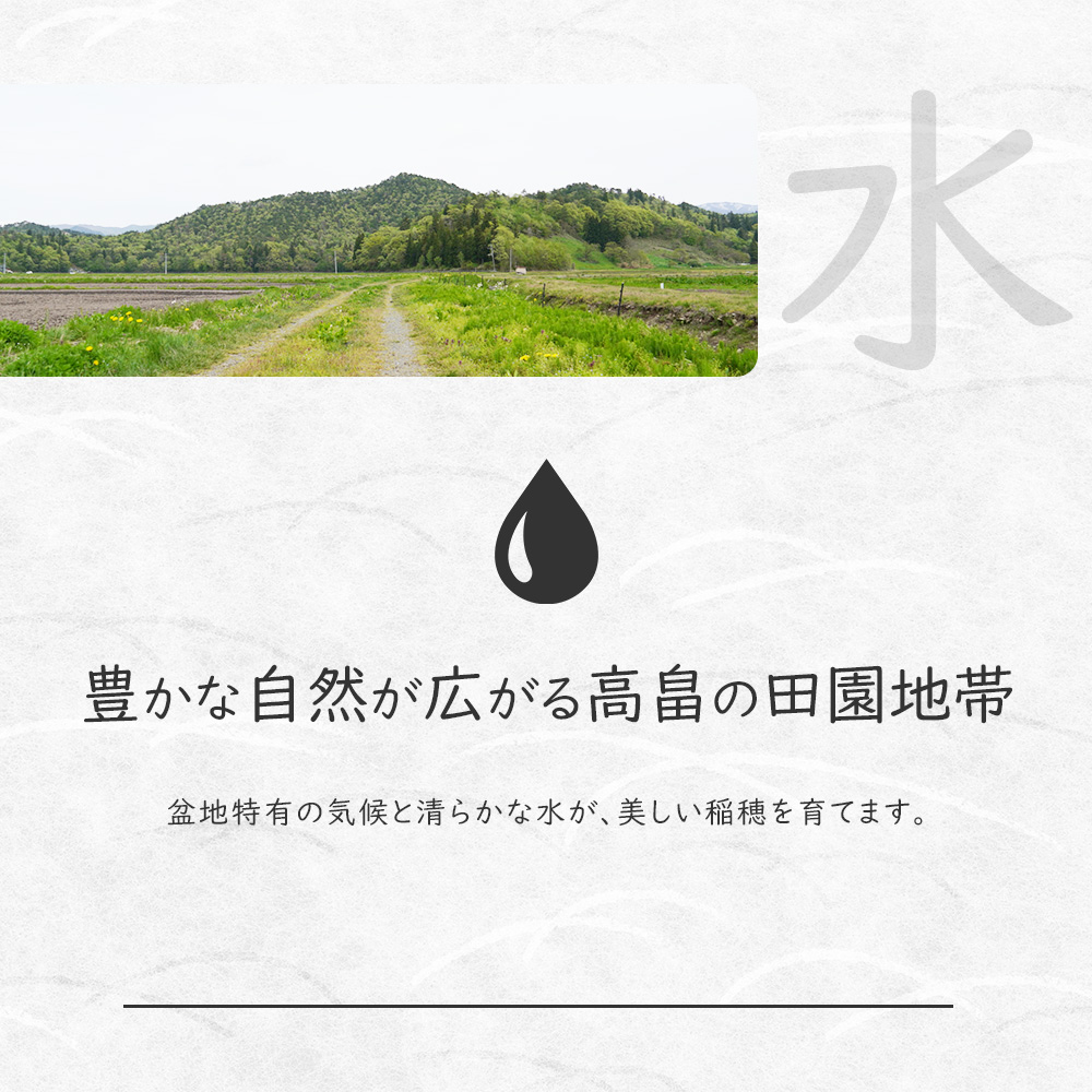 吾妻山や蔵王連峰の伏流水が田んぼを潤す“有機の里”、山形県高畠町。清らかな水、肥沃な黒ボク土、昼夜の寒暖差に恵まれた環境で、遠藤五一さんが丹精込めて育てた特別栽培米です。清冽な水と澄んだ空気、豊かな土が三位一体となり、粒立ちよく香り高いお米が実ります。