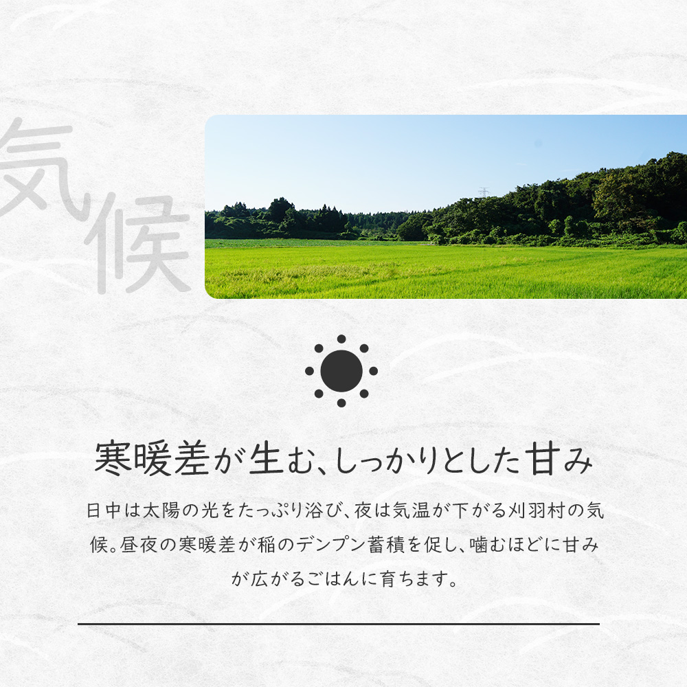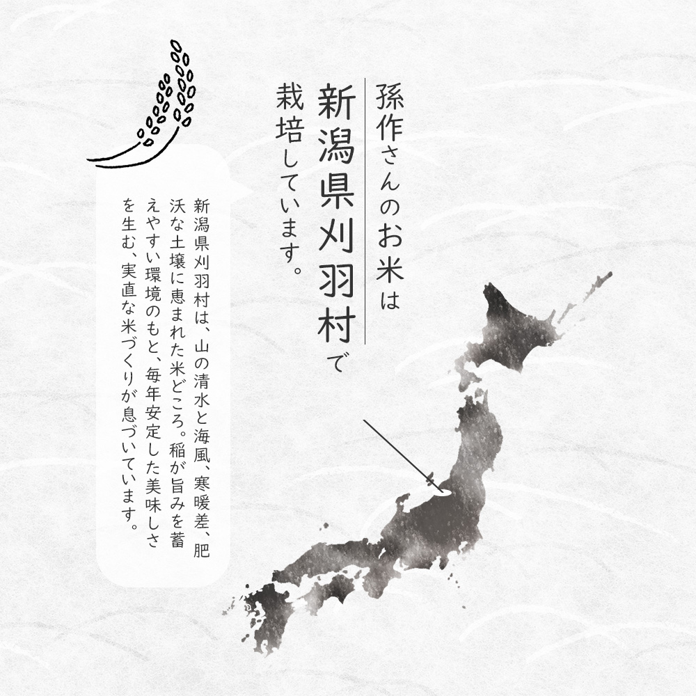 新潟県刈羽村は、日本海にほど近い越後平野の西端に位置する米どころ。山からの清らかな水と海風が交わる独特の環境が、稲に健やかな生育リズムをもたらします。昼夜の寒暖差がほどよく、日中にしっかり光合成し、夜に旨みを蓄積。粘土質を含む肥沃な土壌は保水性に優れ、米の粒張りと安定した品質を支えています。派手さはなくとも、毎年ブレのない美味しさを生む“実直な米づくりの土地”です。