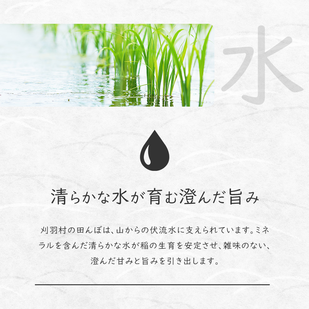刈羽村の田んぼは山からの伏流水に支えられ、ミネラルを含んだ清らかな水が稲の生育を安定させ、雑味のない甘みと旨みを引き出します。