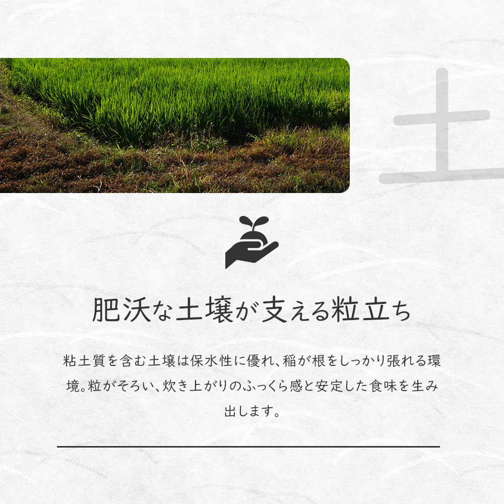 粘土質を含む土壌は保水性に優れ、稲が根をしっかり張ることで粒がそろい、炊き上がりのふっくら感と安定した食味を生み出します。