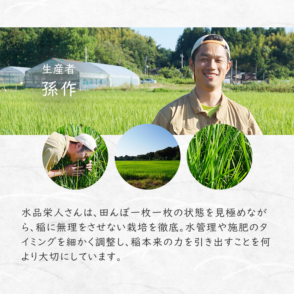 水品栄人さんは、田んぼ一枚一枚の状態を見極めながら、稲に無理をさせない栽培を徹底。水管理や施肥のタイミングを細かく調整し、稲本来の力を引き出すことを何より大切にしています。過度な収量を求めず、味の安定性と質を優先する姿勢が、新大コシヒカリのやさしい甘みと整った粒感につながっています。手間を惜しまない実直な米づくりが、そのまま味に表れた一杯です。