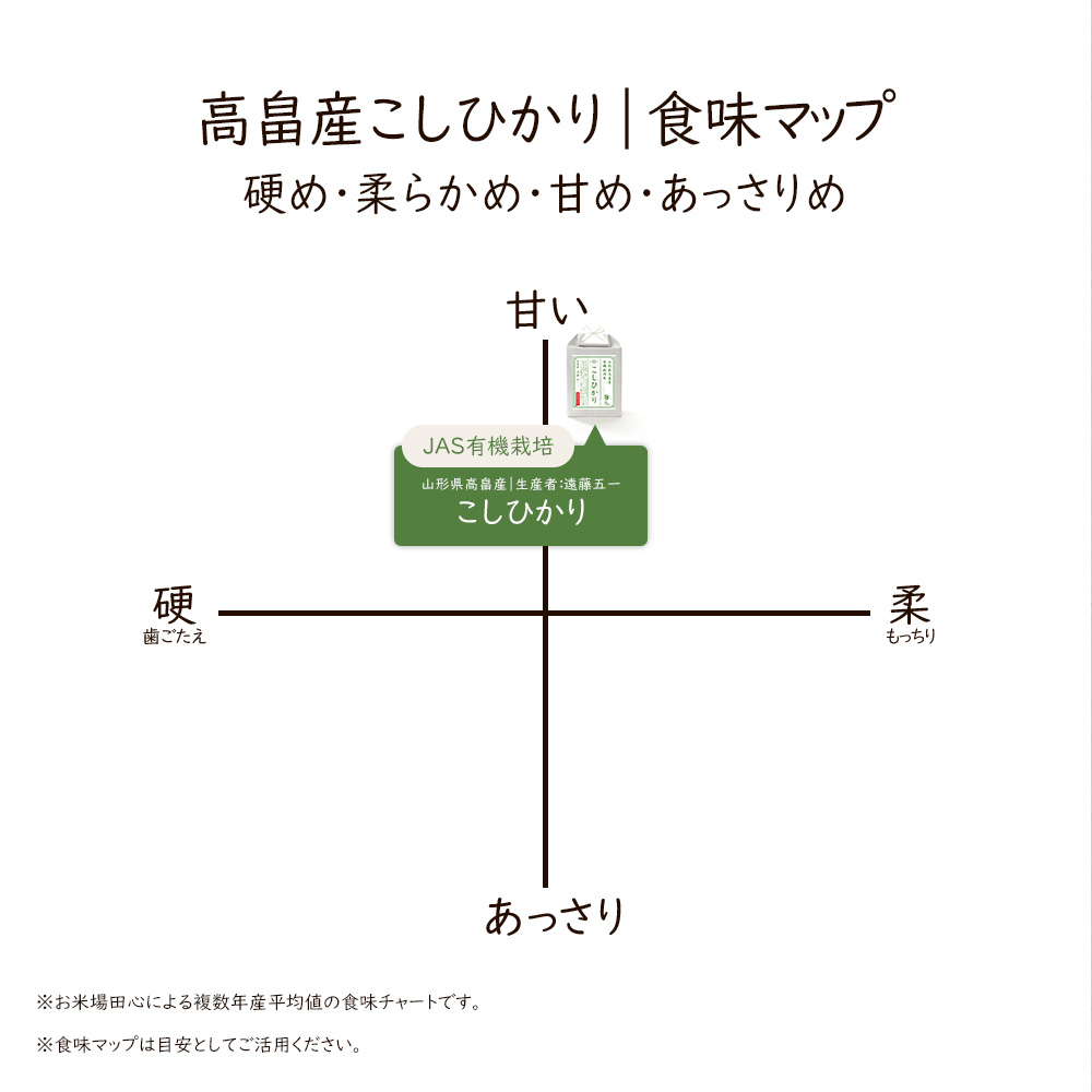 高畠町の肥沃な土壌と澄んだ水で育った有機JAS認証コシヒカリは、粒のそろいが良く炊き上がりはふっくら艶やか。口に入れた瞬間にやさしい甘みと上品な旨みが広がり、噛むほどに滋味深さが感じられます。粘りはしっかりありながら重たさはなく、冷めても美味しさが持続するため、毎日のごはんにも安心して楽しめる味わいです。