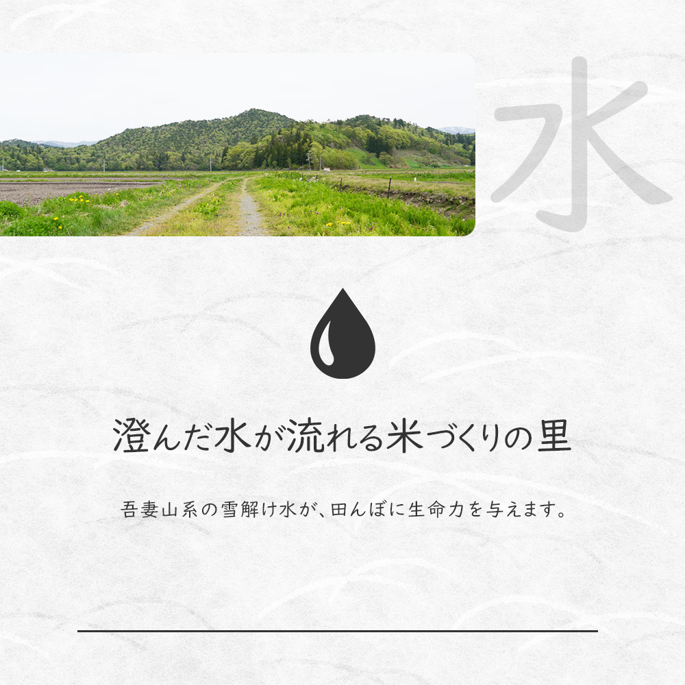 吾妻山系の雪解け水が田んぼを潤し、雑味のない澄んだ旨みを米粒に宿します。